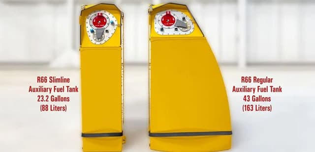 Two, a small and a large, optional auxiliary fuel tanks are available for the R66 Turbine helicopter. The small tank, dubbed the Slimline, holds 23.2 gallons (88 liters), and adds approximately 1 hour to helicopter endurance and extends its range by as much as 100 nautical miles (115 statute miles). It mounts on a fiberglass tray that installs in the aircraft’s baggage compartment, occupies one-third of the space, and leaves room for up to 200 lbs. of baggage. Both tank and tray can be removed when not in use. The tank weighs 29 lbs. when empty and 189 lbs. when full of fuel.