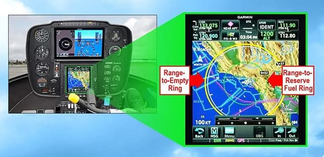 The fuel flow meter provides real-time fuel flow data to the GTN which in turn displays the fuel consumption rate along with fuel range rings on a moving map. Fuel used, fuel remaining, fuel to destination, and other real- time information is also available on accessory pages.