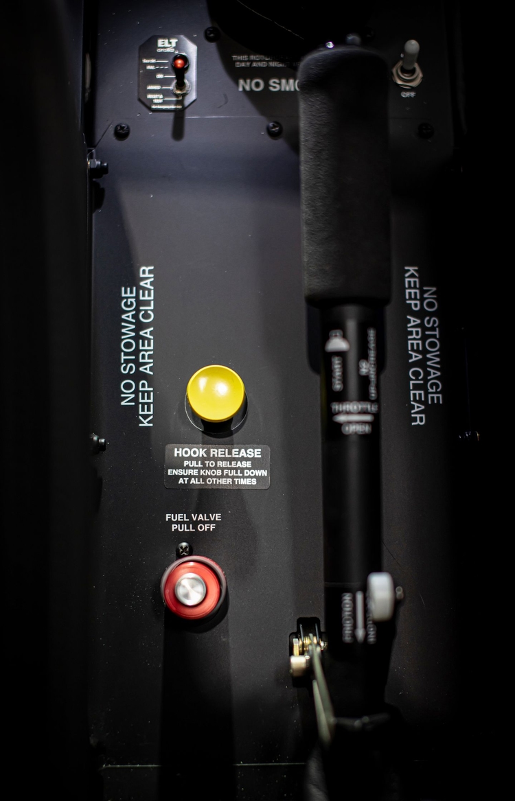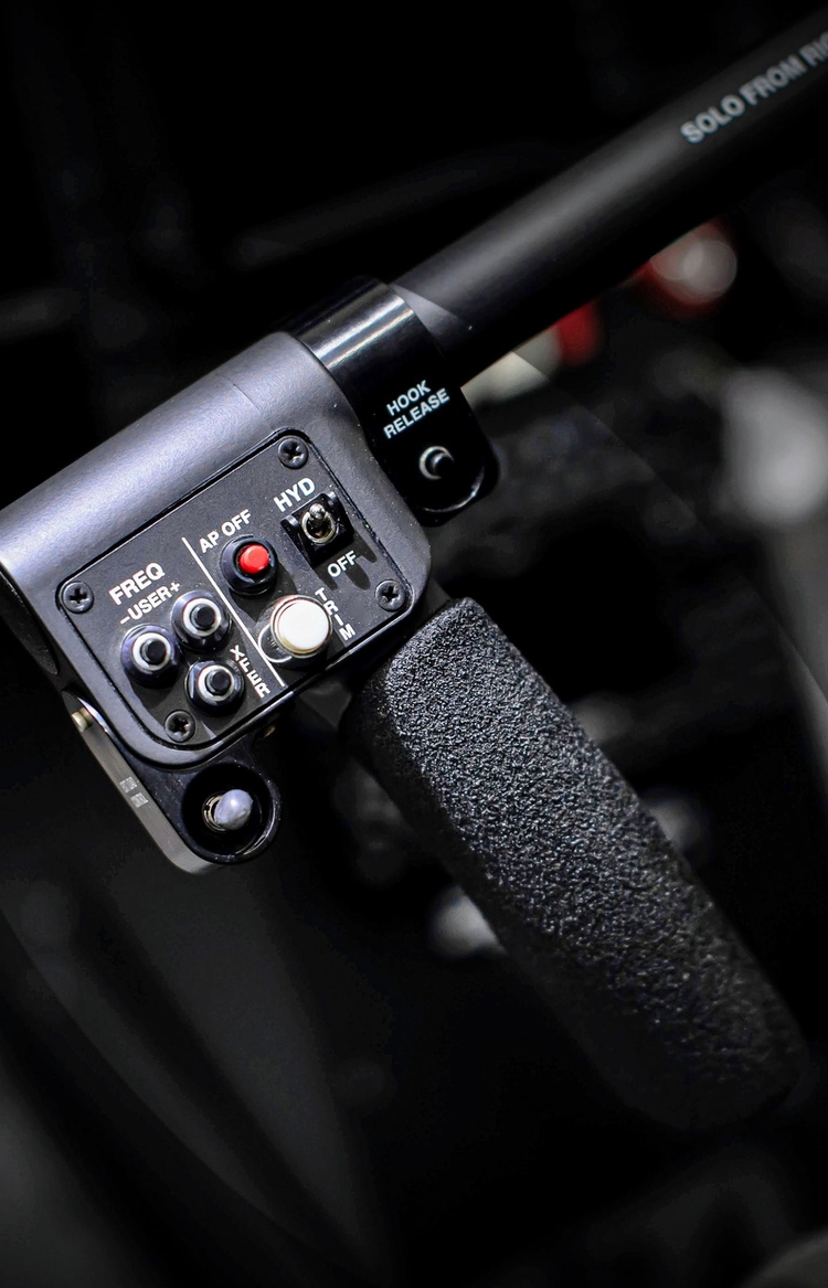 The cockpit is tailored for utility missions with specialized controls, including an upgraded left-side cyclic grip with hydraulic and radio switches and a left-side collective control with a start button. The pilot has command over external devices via left- and right-side electrical and mechanical load releases and switches on the left and right cyclic grips to activate belly circuits.